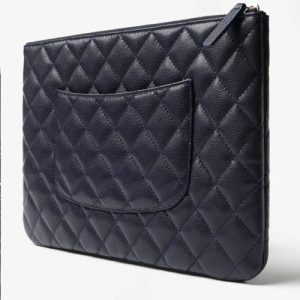 Chiếc Chanel Dark Blue Shiny Grained Organizer được chế tác tinh xảo từ chất liệu da bê (calfskin) vân nổi bóng, kết hợp cùng những viên pha lê Swarovski lấp lánh và kim loại màu bạc, biến một vật dụng tiện ích trở thành một tác phẩm nghệ thuật đích thực. Với kích thước 20 x 27.5 x 1 cm, thiết kế siêu mỏng cùng khóa kéo phía trên giúp bạn dễ dàng cất giữ tài liệu, máy tính bảng hoặc mỹ phẩm một cách gọn gàng và sang trọng.
